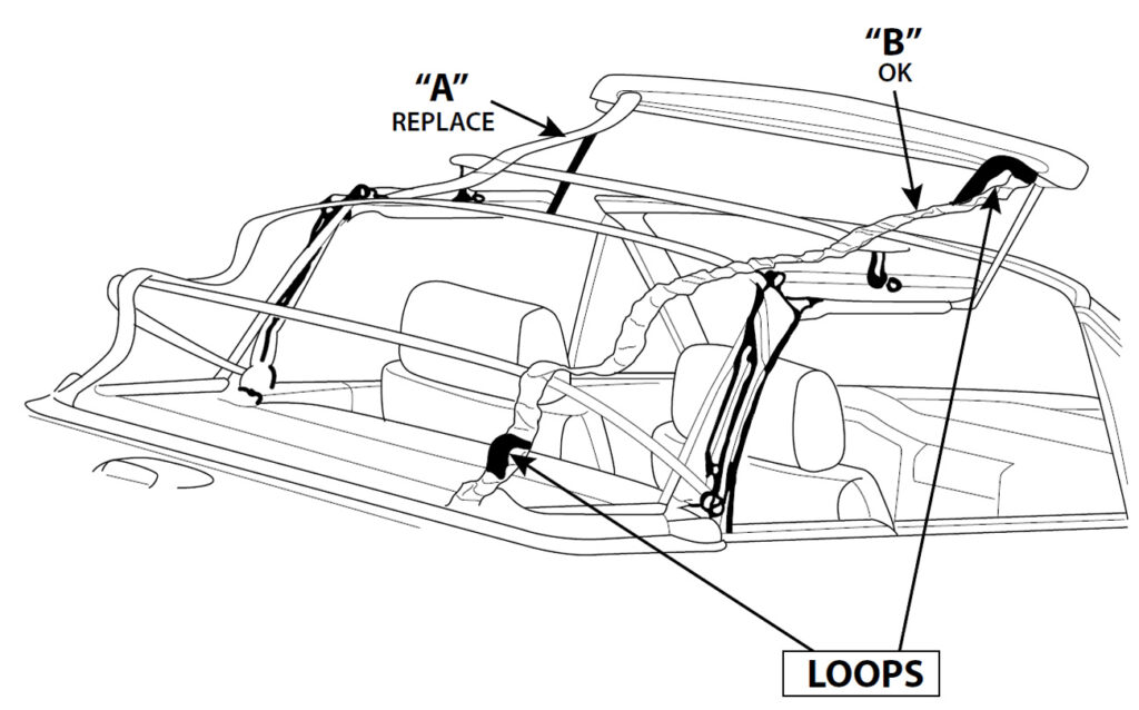 Fold sides of top up to expose the straps on each side. Remove the fasteners holding the straps to each bow and replace the straps with the improved parts. Check and lubricate the pivot points and the rollers on the bow above the rear window for freedom of movement.